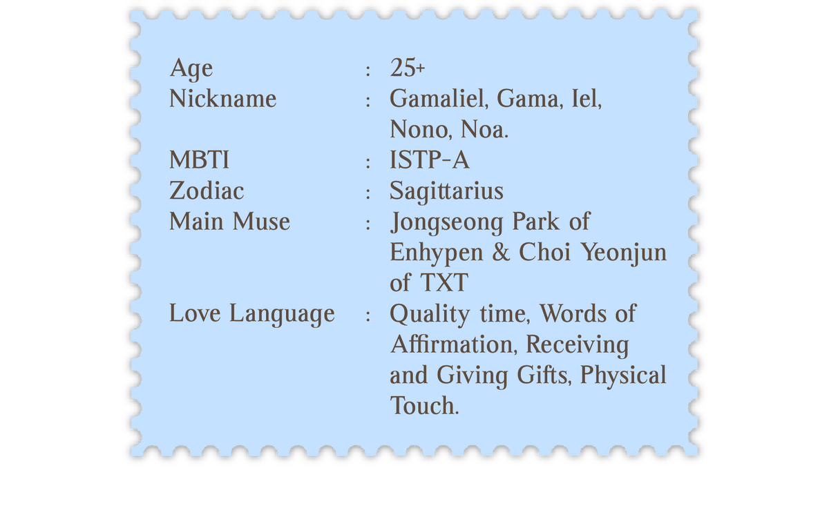 Hello, I’m Gamaliel Noa, but like a garden full of blossoms, you can call me by any petal you find sweet—Gama, Lel, Noa, Nono, or a special name only your heart can craft. Names are like fragrant flowers; they carry tenderness and bloom warmth in my soul. Just promise me one thing: no thorny words here; we keep it gentle and loving.I’m in my twenties, a tender bud past 25, blossoming with an open heart. I’m a Sagittarius, a wild vine always reaching toward the sun, curious and free-spirited. My love language is like a garden in full bloom: quality time like rain nourishing roots, words of affirmation like petals kissed by morning dew, physical touch as soft as velvet leaves, and gifts that are sweet blossoms shared between us. Love, to me, is not a single flower but a lush, radiant bouquet vibrant, warm, and deeply felt.Get to know me, and you’ll find a gardener of hearts who listens deeply. You can share your dreams, fears, or even the whimsical thoughts that flutter like butterflies in your mind. No story is too small or too wild; I’m all ears and all soul.But like a hummingbird drawn to nectar, I’ll buzz with stories too about the movies I cherish: horror, thrillers, myths of old Greece, wizarding spells, anime adventures, and timeless fantasies. Imagination is my garden’s sunlight; let’s wander through it together.